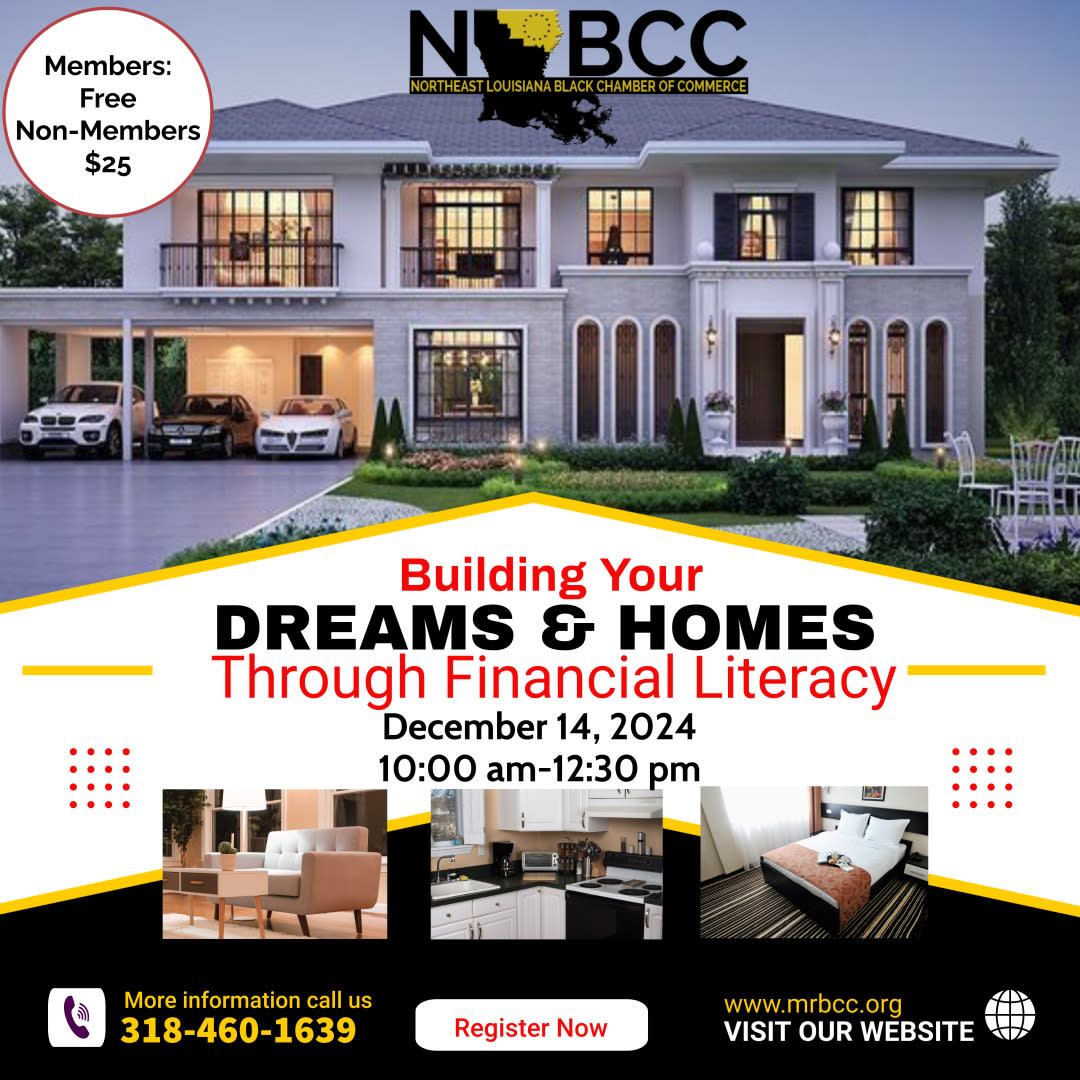 The Northeast Louisiana Black Chamber of Commerce is excited to host an in-depth Housing Seminar designed to help you take the next step toward building your dream home! Credit & Banking: Learn how to prepare your finances for homeownership. Contractors & Land: Understand the key elements of working with contractors and securing land. Bank Approval Process: Get a step-by-step guide on what’s needed for a smooth approval process from the bank. This seminar will provide you with the expert guidance and financial know-how needed to turn your dream home into a reality. Don’t miss this opportunity to gain the tools and knowledge to build the home you've always wanted!Images
